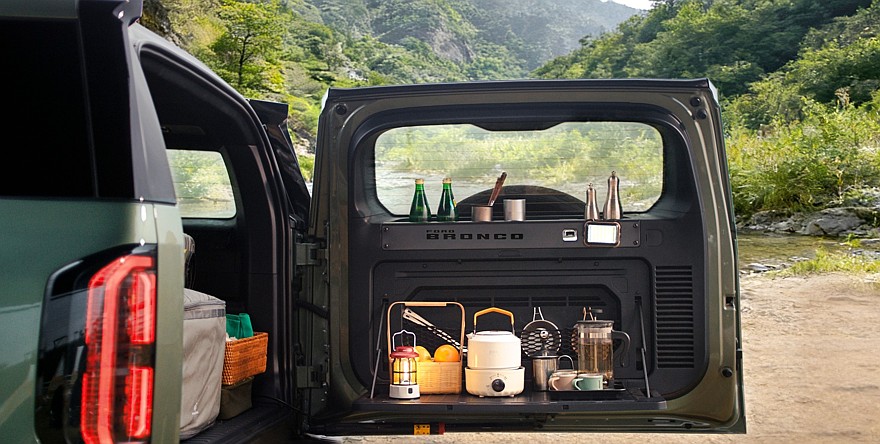 Салон — строго пятиместный. За доплату предлагается кемпер-версия, благодаря которой кроссовер носит имя Bronco Basecamp: в оснащение такой версии входит подъёмная стеклянная крыша с электроприводом — она нужна, чтобы было больше место над головой, когда поверх сидений укладывается двуспальный матрас, извлекать вещи из багажника при этом не нужно. Распашная багажная дверь превращается в пищеблок с откидным столиком. Для питания электроприборов предусмотрена розетка на 6,6 кВт. Для хранения еды и напитков между передними креслами есть 7,5-литровый термобокс, способный поддерживать низкую либо высокую температуру.
