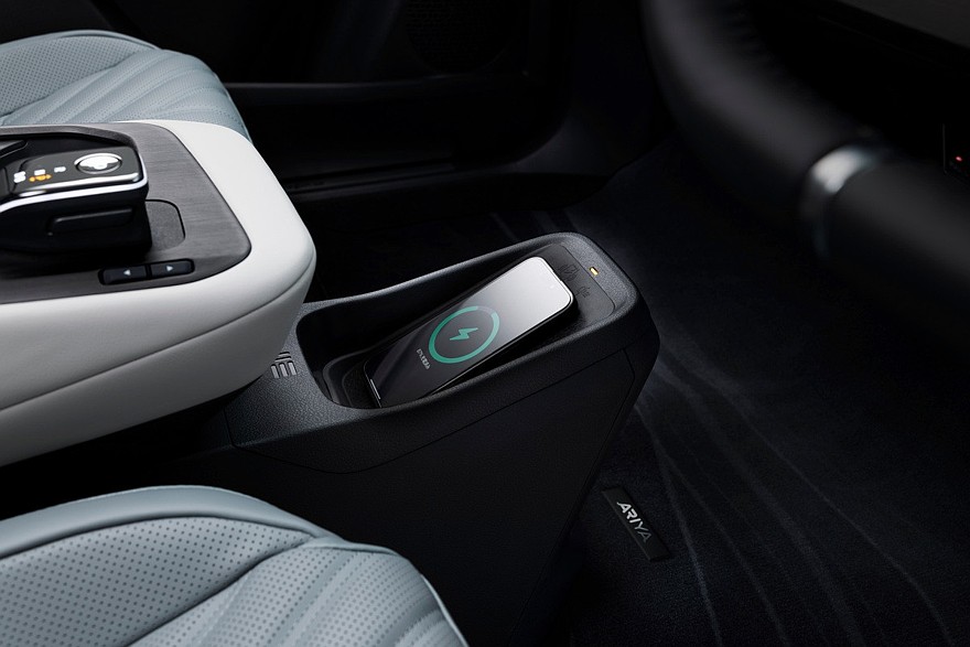 В салоне значимых обновок нет, разве что интерьер Ariya теперь может быть обит бело-зеленой кожей, плюс кроссоверу досталась улучшенная мультимедийная система с сервисами Google. Для паркетника еще заявлены функция Vehicle-to-Load (V2L; позволяет использовать энергию для питания внешних электроприборов) и система «интеллектуального контроля дистанции».