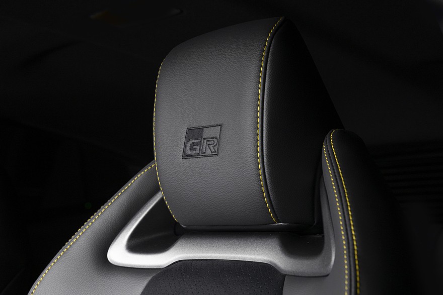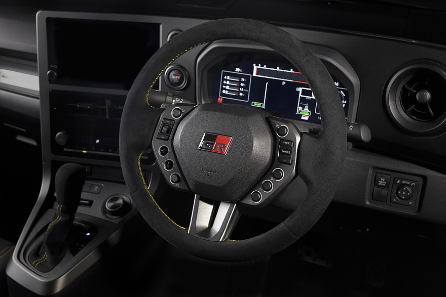 В салоне GR Yaris Morizo RR установлено гоночное круглое трёхспицевое рулевое колесо, специально разработанное для этой особенной версии. Оно отделано чёрной замшей и дополнено контрастной жёлтой прострочкой (как и ряд других элементов в салоне). Также на нём размещены «олдскульные» физические кнопки, позволяющие в том числе управлять аудиосистемой. Ещё интерьер украсила говорящая об эксклюзивности табличка с серийным номером и эмблемой Morizo RR.
