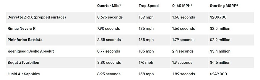 Совершенно стандартный Corvette ZR1X в базовой комплектации на стандартных шинах Michelin Pilot Sport 4 S и заправленный обычным бензином смог проехать четверть мили (402 м) всего за 8,675 с, показав на выходе скорость 256 км/ч, а разгон до 60 миль/ч (96,56 км/ч) занял всего 1,68 с. Но есть нюанс: эти значения были достигнуты на подготовленной поверхности, обеспечивающей наилучшее сцепление с шинами. Вместе с этой оговоркой пресс-служба GM включила Corvette ZR1X вот в такую сравнительную таблицу: