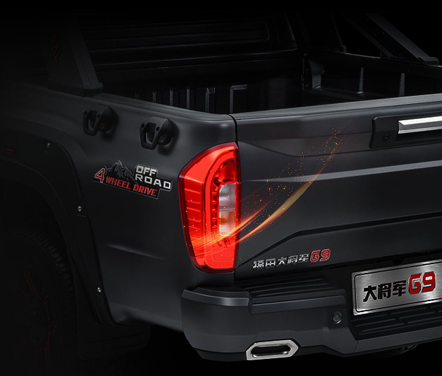 Tunland G9 снабдили полноценными рейлингами на крыше, традиционными наружными зеркалами, обычными дверными ручками, окрашенными в цвет кузова, массивными накладками на колёсные арки из некрашеного пластика, оригинальными красно-чёрными колёсными дисками. Корма получила вертикальные фонари, серебристую ручку для откидного борта, подножки на заднем бампере.