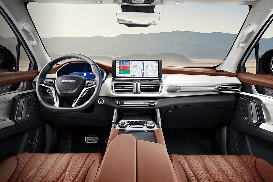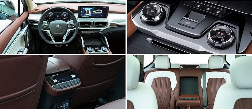 Внутри внедорожник MG тоже скопировал модель Maxus. Над передней панелью возвышается крупный планшет мультимедийной системы, под центральными дефлекторами обдува есть ряд физических клавиш. На тоннеле расположены две площадки для беспроводной зарядки, пара шайб и прикрытые шторкой подстаканники. В списке оборудования также заявлены панорамная крыша, подогрев, вентиляция и массажер сидений, камеры кругового обзора и адаптивный круиз-контроль. MG Rakan имеет семиместный салон.