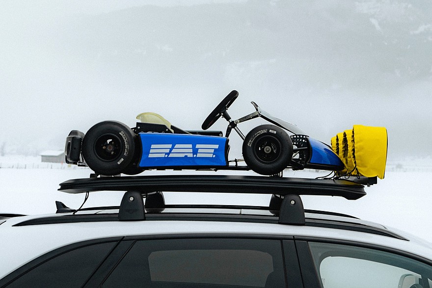 Для пущего эффекта на крышу машины установили экспедиционный багажник с мощной светодиодной «люстрой», на этот багажник погрузили электрический карт. И вот со всем эти барахлом и норвежской лыжницей на тросе Крис Харрис завтра будет утюжить снежную трассу в Целль-ам-Зее.