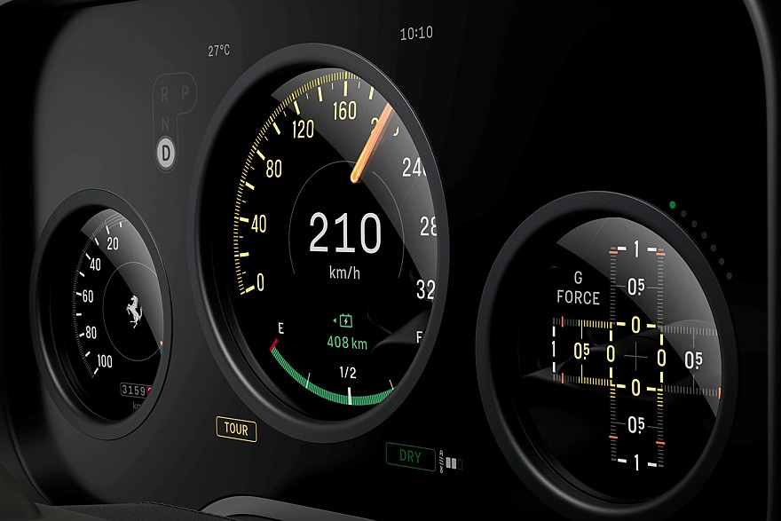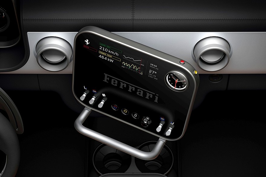10-дюймовый мультимедийный экран напоминает iPad, в который врезали тумблеры системы микроклимата и большие часы — они находятся в верхнем правом углу и могут выполнять роль секундомера, компаса и индикатора работы системы launch control. В рамке над часами есть две физические клавиши, в сочетании с которыми часы напоминают классический будильник. Под корпусом экрана находится алюминиевый поручень для рук, он поддерживает запястье в процессе работы с экраном. OLED-экраны для Ferrari Luce поставляет Samsung.