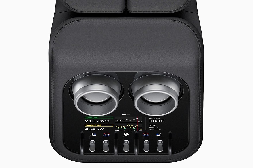 На верхней поверхности центрального тоннеля разместился маленький селектор режимов трансмиссии, выполненный в виде стеклянного цилиндра с подсветкой, он ходит по L-образному пазу. Слева от селектора находится слот для ключа. В ключ встроен экран с электронными чернилами, он подсвечивается и меняет цвет, когда ключ попадает в слот.