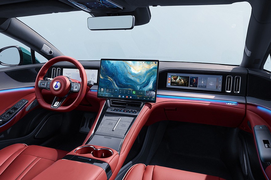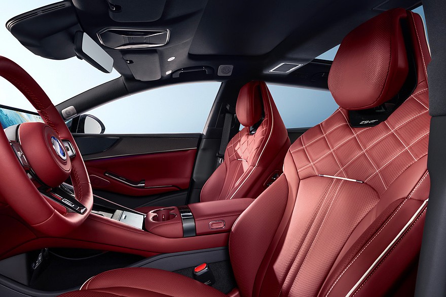 На центральном тоннеле – две новые площадки для беспроводной зарядки, ряд физических клавиш переместили ближе к воздуховодам, а место привычного селектора коробки занял отсек для мелочевки с крышкой. Другими стали и подстаканники. Denza Z9 GT еще достались новые передние кресла. Наконец, предусмотрена отделка кожей цвета Lava Red.