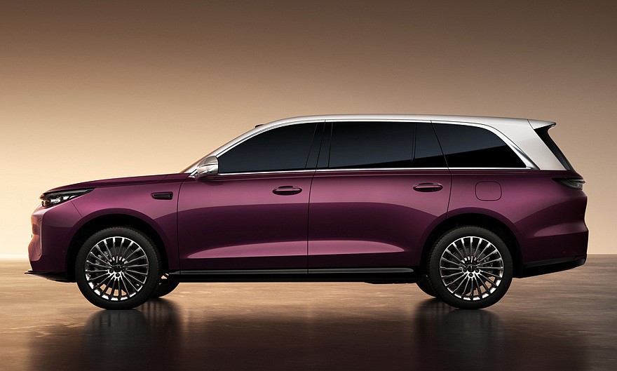 Еще Wey V9X достались обычные ручки дверей и объединенные светящейся же плашкой вытянутые задние фонари. Синяя подсветка – признак автопилота, как и лидар над лобовым стеклом. К слову, ранее в Wey заявили о том, что автопилот – на базе искусственного интеллекта. Кроссоверу положены 21-дюймовые диски. Наконец, предусмотрена двухцветная окраска кузова.
