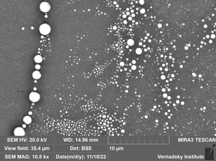 Фото под сканирующим электронным микроскопом: одна из мишеней (базальт), где после эксперимента появились цепочки и россыпи наносферулы металлического железа. Е. Сорокин