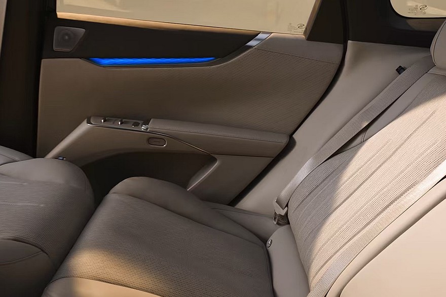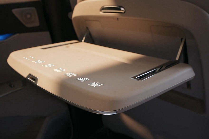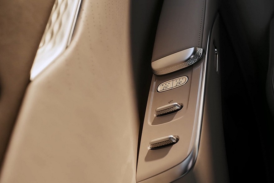 На центральном тоннеле – площадка для беспроводной зарядки и пара неприкрытых подстаканников. В торец тоннеля встроен выдвижной ящик с функциями подогрева и охлаждения. За управление трансмиссией отвечает подрулевой рычажок. Все кресла имеют подогрев и вентиляцию, у передних вдобавок есть массажер. Пассажирское переднее сиденье – еще и с подставкой для ног. Подголовники можно убрать, тогда получатся спальные места. В списке оборудования также заявлена аудиосистема с 20 динамиками (включая динамики в подголовнике водительского кресла).