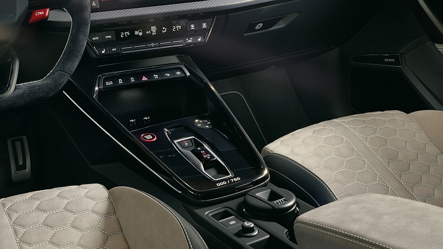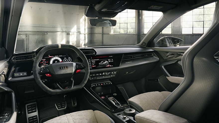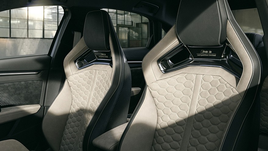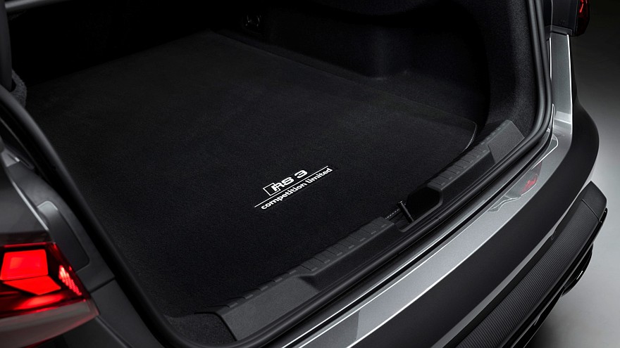 Интерьерные особенности версии competition limited — это золотисто-имбирные замшевые вставки в креслах и дверных картах, обитый замшей руль с меткой центрального положения, световая проекция надписи RS 3 competition limited на землю при открытых дверях, коврики с надписью RS 3 competition limited и номерная табличка за кнопочным селектором коробки передач. Комплектация очень богатая, в неё входят в том числе мощная аудиосистема Sonos и полный набор электронных ассистентов водителя.