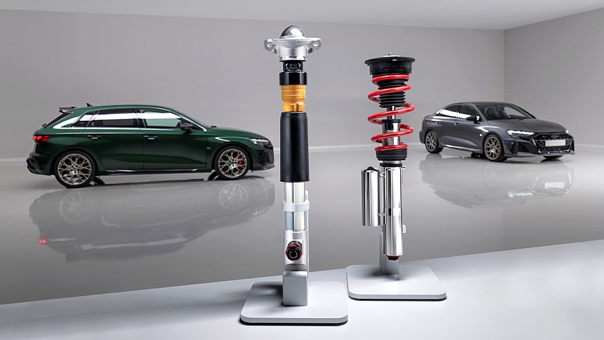 Двухтрубные амортизаторы с многоступенчатыми регулировками на отбой и сжатие Audi RS 3 получил в стоке впервые, причём регулировать их нужно вручную с помощью специального инструмента (инструкция идёт в комплекте), передние амортизаторы вдобавок снабжены внешними резервуарами. В комплект также входят новый задний стабилизатор поперечной устойчивости, износостойкие карбон-керамические тормоза с красными суппортами и очень цепкие в сухую погоду полуслики Pirelli PZero Trofeo R.