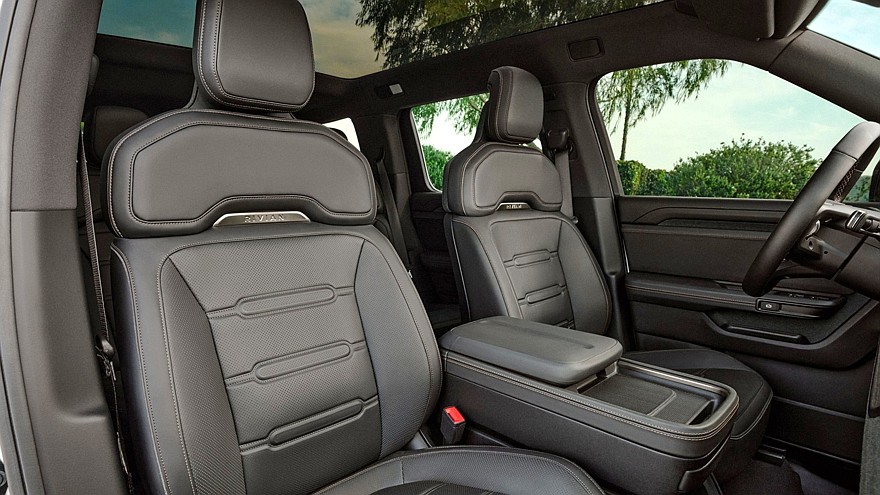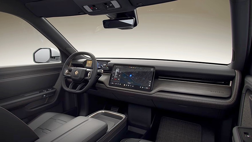 Кузов у Rivian R2 несущий и строго пятиместный. Салон оформлен в том же стиле, что у внедорожника Rivian R1S, но есть много мелких отличий, главное из которых — два колёсика прокрутки, встроенные в спицы руля, с их помощью можно настроить практически все функции автомобиля. В переднюю панель врезаны сразу два вместительные бардачка. В базовое оснащение входят подогрев руля и передних сидений, электропривод регулировок передних сидений и мощная 525-ваттная аудиосистема с семью динамиками. В дорогих комплектациях ещё более мощная музыка, улучшенная отделка, куча электронных ассистентов водителя и прочие удобства.