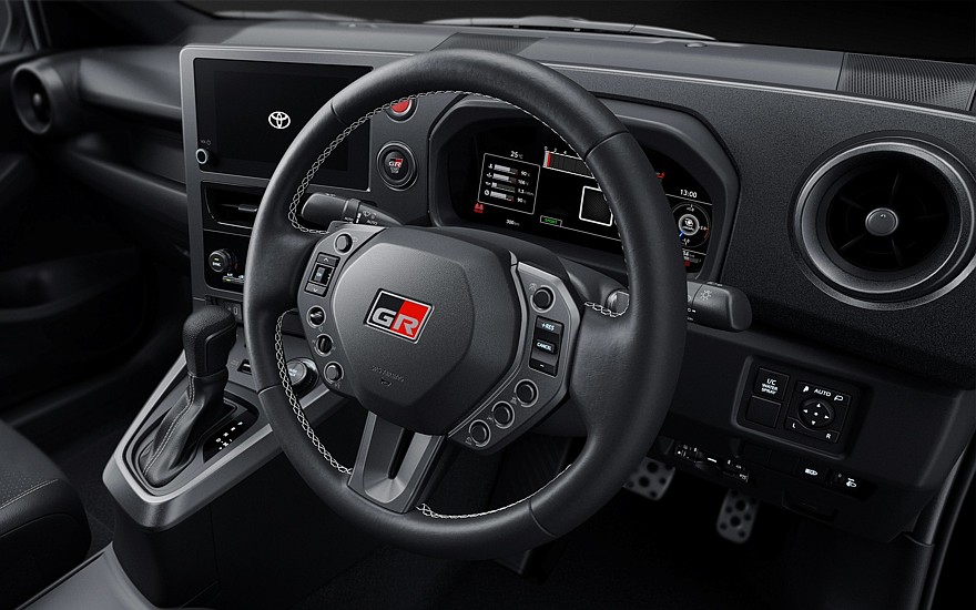Все версии GR Yaris 2026 модельного года получили новый GR-руль, впервые засвеченный ранее в этом году на спецверсиях Morizo RR и Sébastien Ogier 9x World Champion Edition. Этот руль разработан с учётом пожеланий и отзывов опытных владельцев GR Yaris, практикующих гоночный стиль езды: диаметр обода уменьшен на 5 мм до 360 мм, убраны упоры для больших пальцев (они мешают при быстром вращении и перехватах), а сервисные клавиши сконцентрированы ближе к ступице, чтобы их было сложнее случайно задеть. Вдобавок клавиши разнесены по бо́льшей площади и снабжены подсветкой, чтобы снизить вероятность ошибочных попаданий.