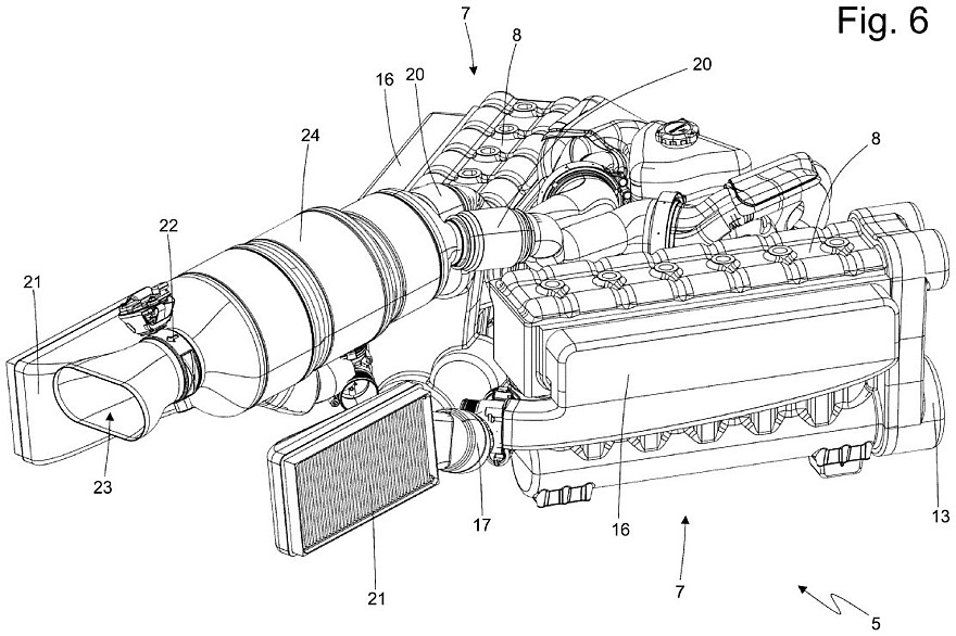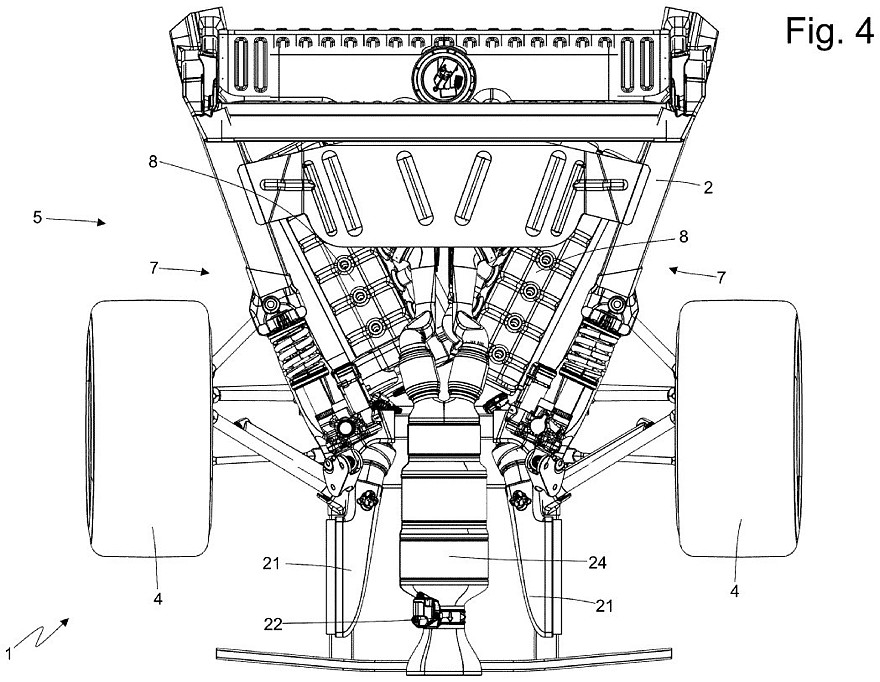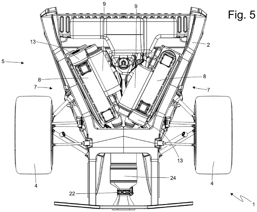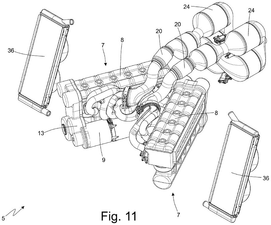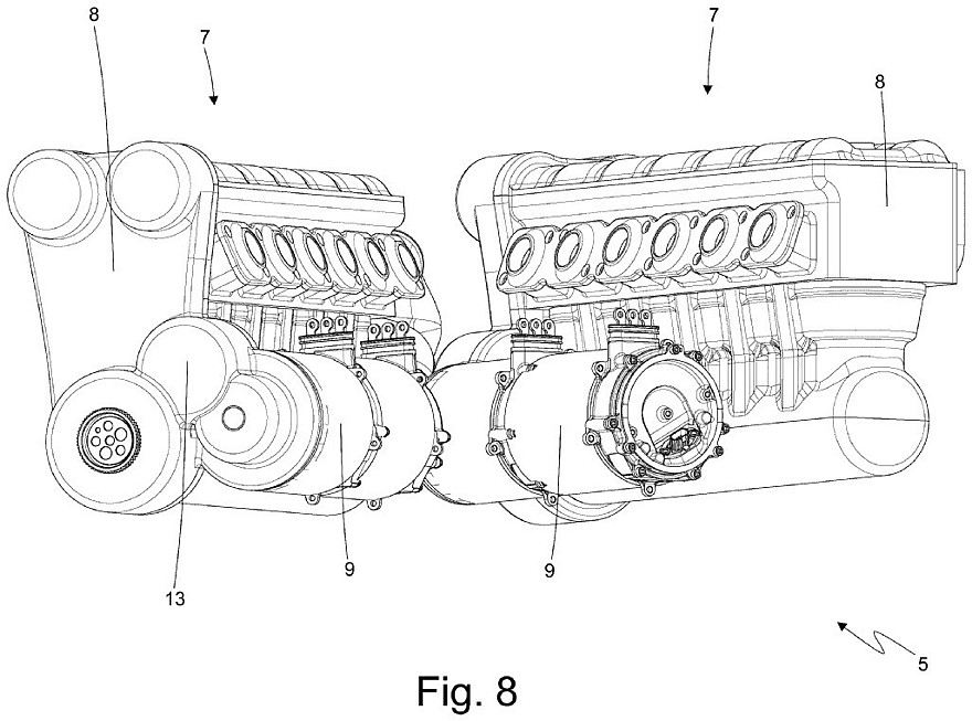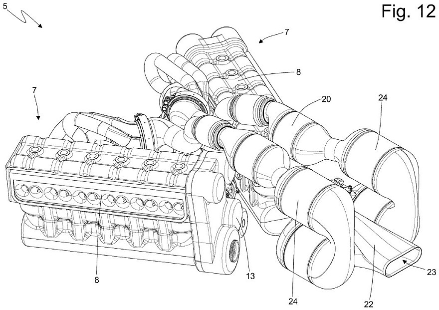 Каждая рядная «шестёрка» имеет собственный коленвал и состыкована с собственным генератором для выработки электроэнергии, а объединяют две половинки двигателя общая система смазки, общая система выхлопа и общий блок управления. Расположение половинок двигателя в виде буквы V при взгляде сверху позволяет уменьшить габаритную длину 12-цилиндрового двигателя и вписать его узкое пространство между задними колёсами. На патентных картинках представлены несколько вариантов компоновки системы выхлопа и системы охлаждения.