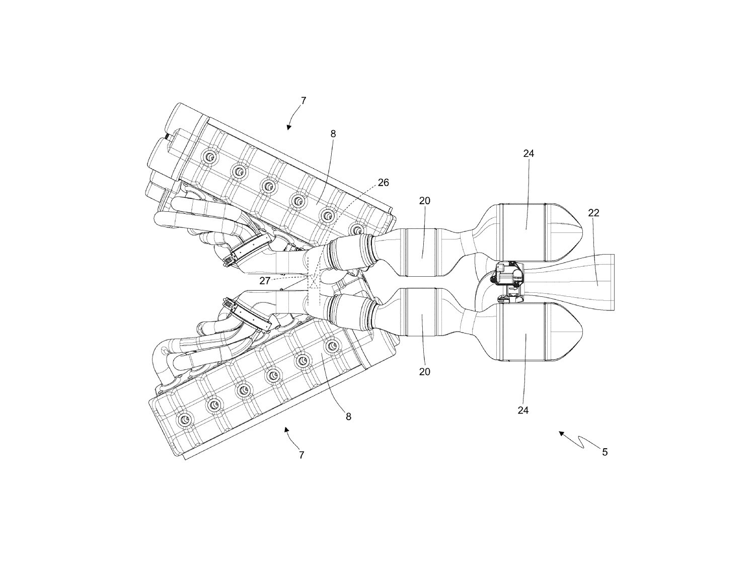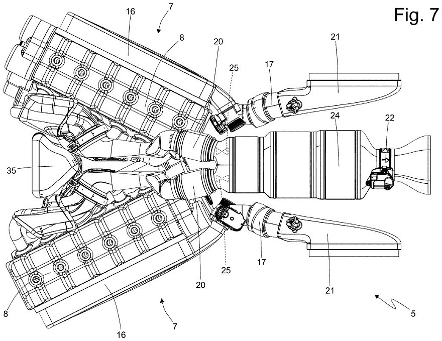 Ferrari хочет исправить все недостатки последовательных гибридов сразу и предлагает своё решение для среднемоторных суперкаров. Прежде всего, нужен очень мощный ДВС, который обеспечит хорошую динамику даже при разряженной батарее и с учётом всех потерь на преобразование энергии. Таким двигателем будет необычный V12, состоящий из двух рядных «шестёрок», которые образуют букву V при взгляде не с торца, а сверху.