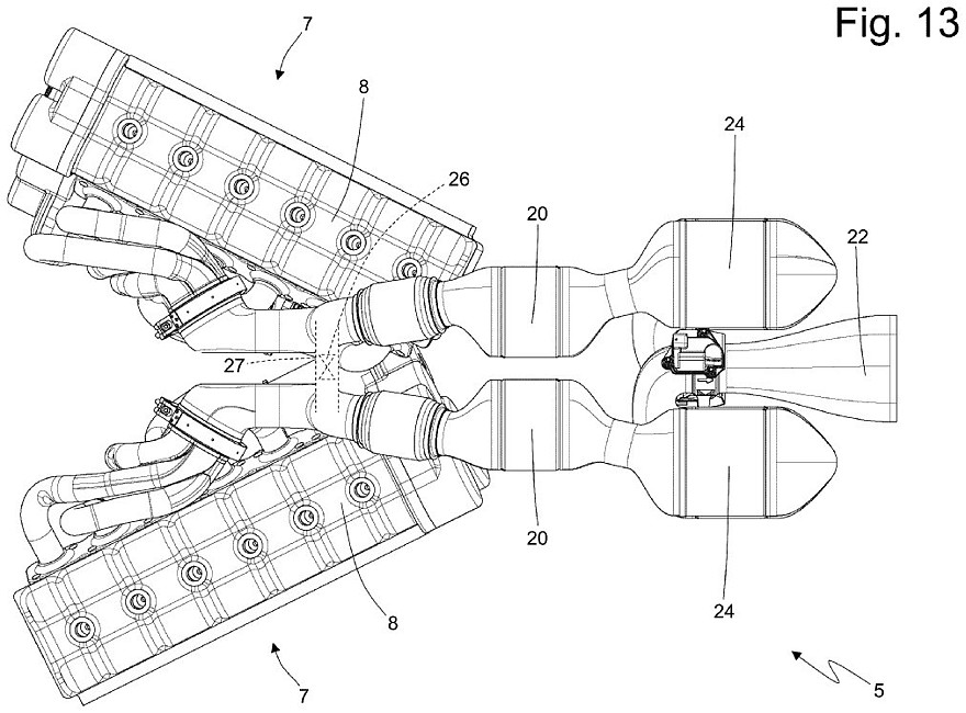 В электронной базе WIPO (Всемирная организация интеллектуальной собственности) всплыла любопытная конструкция гибридной силовой установки последовательного типа для серийных суперкаров Ferrari, в основе которой лежит невиданный прежний двигатель V12, состоящий из двух рядных «шестёрок» (каждая со своим коленвалом), объединённых общей системой смазки и общей системой выхлопа.
