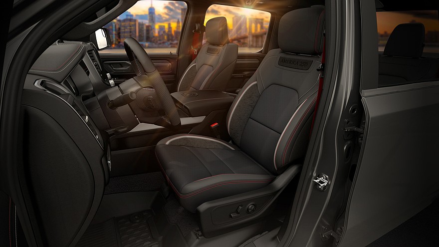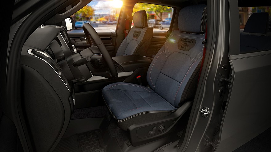 В салоне Ram 1500 America250 тоже имеются свои особенности. У исполнения Big Horn обивка сидений выполнена из синей ткани Denim Soul и дополнена контрастной белой и красной прострочкой. Аналогичные «нитки» используются для оформления центрального подлокотника и дверных карт, а на рулевом колесе можно разглядеть красно-бело-синюю прострочку. Эмблема с названием версии расположена на дверце бардачка, а также на сидениях.