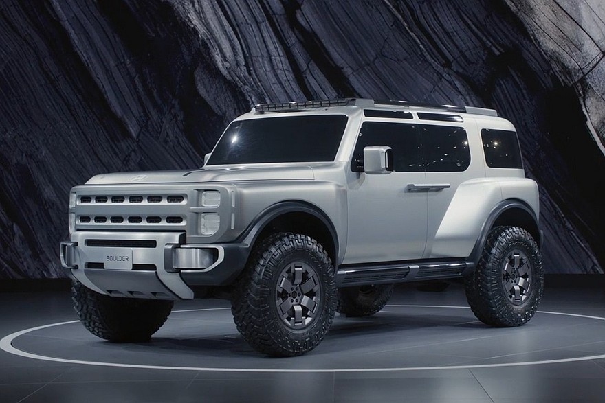 Концепт Hyundai Boulder создан американской командой дизайнеров. Внешность выполнена в нарочито брутальном стиле. Среди особенностей экстерьера – раздутые бока в стиле классического Land Rover Defender, внушительные бамперы, прорези в радиаторной решетке, вертикальные блоки фар и задних фонарей, люстра на крыше.