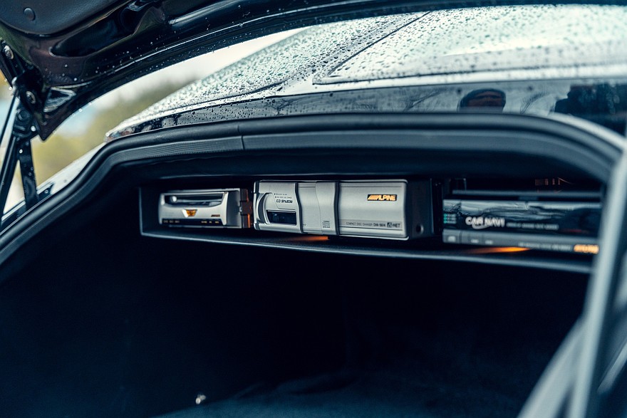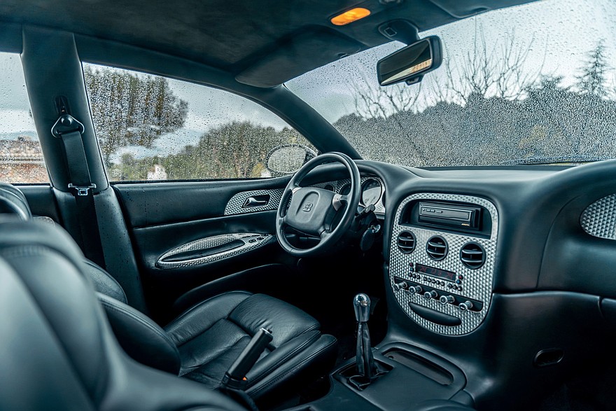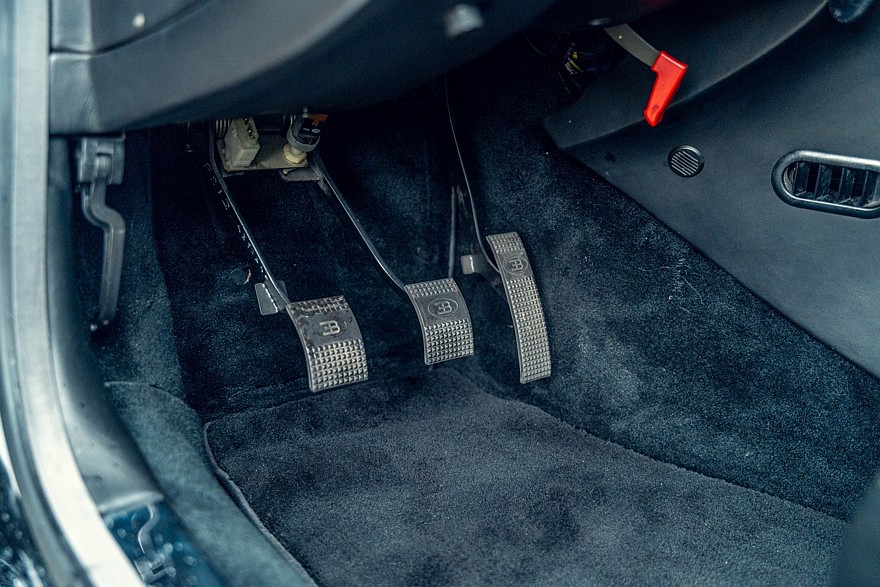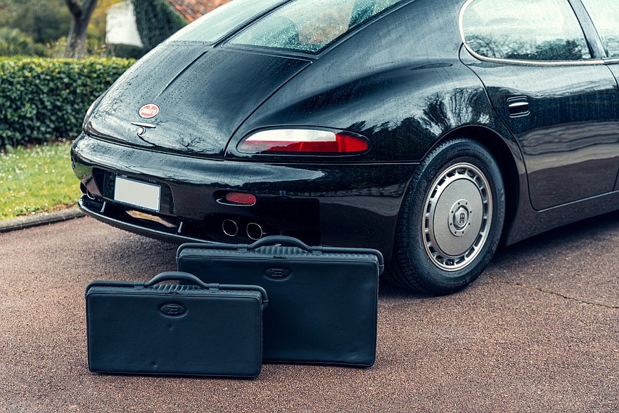 Четырёхместный салон проработан весьма тщательно для предсерийной машины и выглядит новым, потому что за прошедшие годы пробег составил всего 388 км. Приборы — исключительно аналоговые. На широкой центральной консоли можно разглядеть непропорционально мелкий кнопочный блок микроклимата, а в её верхнюю часть несколько неказисто встроена магнитола формата 1DIN. В багажнике на полке под крышкой установлено дополнительное музыкальное оборудование, в том числе бессмысленный по нынешним временам CD-чейнджер Alpine. В комплект входят два фирменных чемодана, набор инструментов и зонтик с рукояткой в виде скульптуры «Танцующего слона» авторства Рембрандта Бугатти — это брат Этторе Бугатти, основателя автомобильной компании Bugatti.