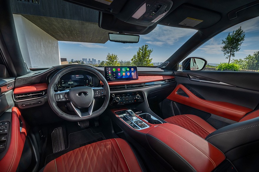 Внутри QX65 дословно повторил родственника, не считая отсутствия третьего ряда кресел. Уже в базе есть виртуальная приборка на 12,3 дюйма и аналогичного размера планшет мультимедиа, беспроводная зарядка для смартфона, трехзонный климат-контроль, подогрев руля и передних кресел. В списке стандартного оборудования также значатся панорамный люк, электропривод багажной двери и комплекс водительских ассистентов ProPilot. Топовый кроссовер Infiniti QX65 Autograph – это еще вентиляция и массажер передних сидений, подогрев задних кресел, проекционный дисплей, аудиосистема Klipsch с 20 динамиками (включая динамики в подголовниках передних сидений). Опционально для самой роскошной комплектации предусмотрен комплекс ProPilot Assist 2.1: благодаря ему водитель может убрать руки с руля, но только на «совместимых автомагистралях».