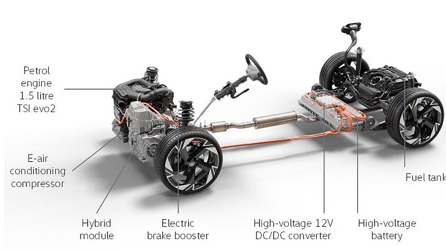 Новая гибридная силовая установка рассчитана только на передний привод, бензиновый двигатель 1.5 TSI evo2 и гибридный силовой модуль пристыкованы друг к другу и расположены спереди поперечно. Тяговая литий-никель-марганец-кобальтовая батарея ёмкостью 1,6 кВт·ч с жидкостным охлаждением находится перед задней осью, где обычно размещают топливный бак. Бак в данном случае находится за задней осью под полом багажника. Такая компоновка выбрана, вероятно, для оптимальной развесовки.