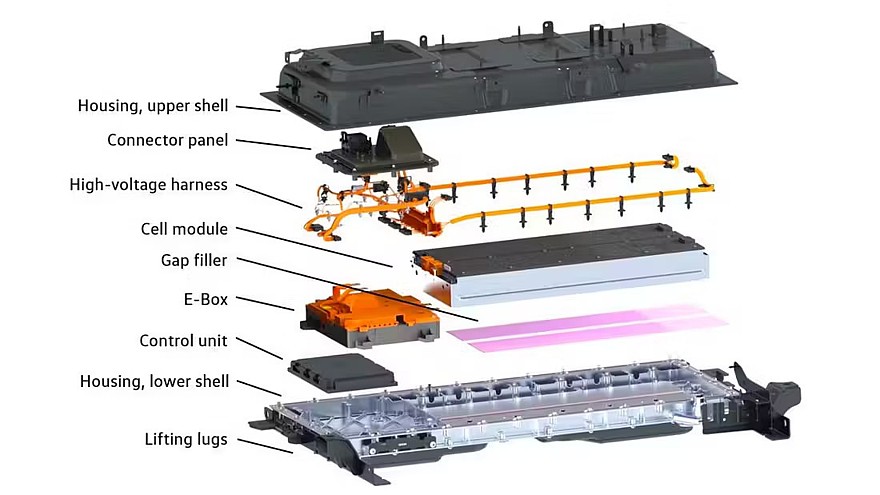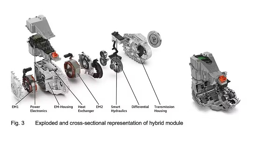 Двигатель 1.5 TSI evo2 переведён на экономичный цикл Миллера, максимальная отдача — 110 кВт (150 л.с.) и 250 Нм. В гибридный модуль входят две электрические машины (EM1 и EM2 на схеме ниже). EM1 может выдавать до 110 кВт (150 л.с.) и работает в режиме генератора, заряжая тяговую батарею. EM2 — это тяговый электромотор с пиковой мощностью в 125 кВт (170 л.с.) и крутящим моментом до 2500 Нм на колёсах. EM2 связан с дифференциалом и гидравлическим сцеплением, которое может отсоединять электромотор от ДВС. Если сцепление выключено, то ДВС либо заглушен, либо крутит только генератор и заряжает батарею. С включённым сцеплением ДВС и электромотор вместе вращают колёса.