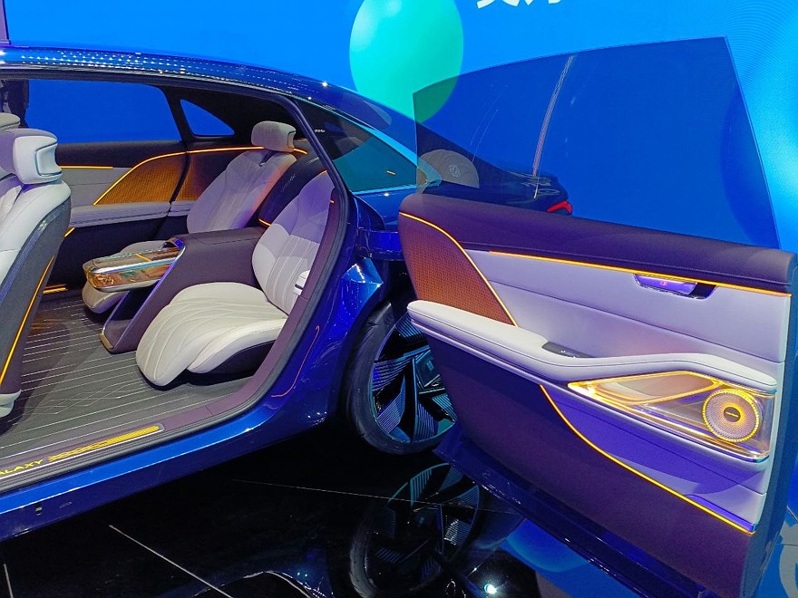 Второй ряд сидений предполагает два отдельных кресла с оттоманкой и солидным пространством для ног пассажиров, а между ним располагается ниша с прозрачным боксом для хранения мелочевки вроде записной книжки, украшений и солнечных очков. В дверные карты встроены подсвечиваемые динамики, а на порогах есть накладки с желтыми узорами и надписью Geely Galaxy.