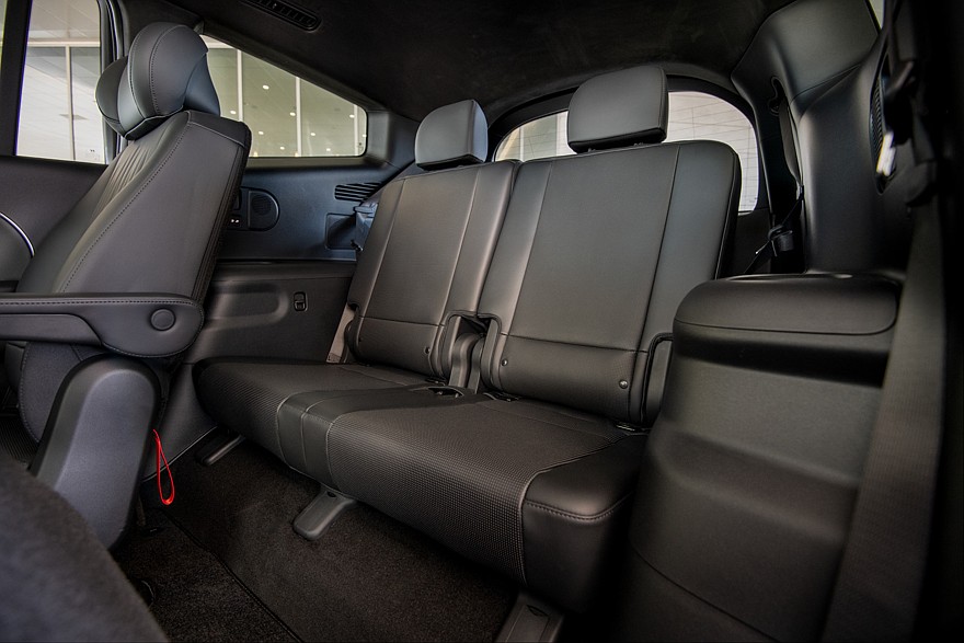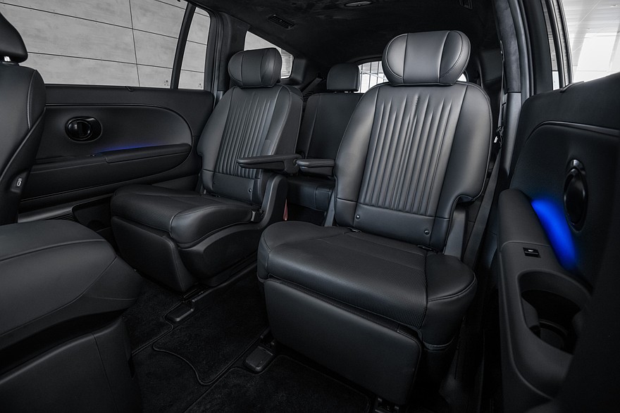 Максимально «затемнённый» вариант Hyundai Ioniq 9 Calligraphy Black Ink можно получить, если заказать его в кузове, окрашенном в чёрный цвет Abyss Black Pearl (как на предоставленных снимках). Салон отделан материалом H-Tex чёрного цвета, кресла получили обивку с необычным рисунком, а потолок – обивку из «экозамши». Первый и второй ряд кресел получили подогрев и вентиляцию, для третьего ряда предусмотрен только подогрев.